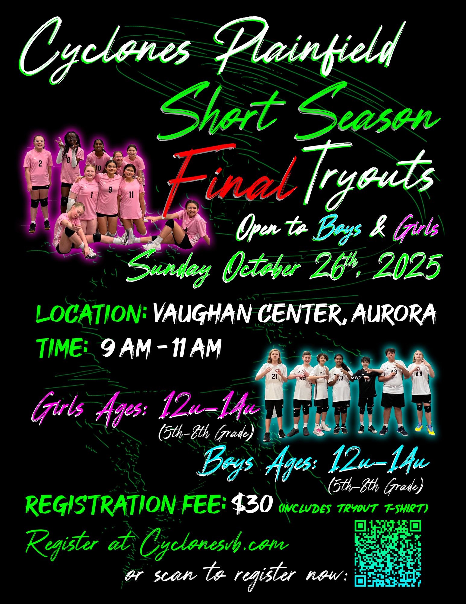 Tryouts have concluded for the Winter Short Season. Please contact cyclonesvolleyballclub@gmail.com with any questions.